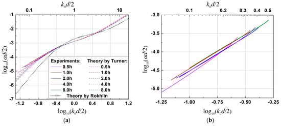 In order to further compare the frequency dependence of attenuation between the classical prediction and the experimental study, the logarithmic scale of normalized attenuation per length, α/2, versus normalized frequency, k0/2, is plotted in Figure 10a, where is the wave number of the effective medium. As predicted by the classical theoretical model [,], these curves were expected to be independent of grain sizes. Nevertheless, due to a slightly different distribution width of grain sizes, an insignificant deviation between samples was observed for data with a fitted log-normal grain size distribution.