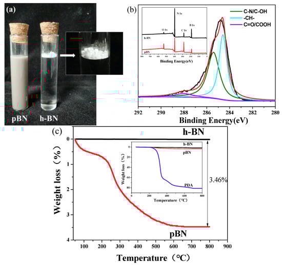 Figure 2a shows dispersions of h-BN and pBN in water. Given its inert surface, h-BN tends to agglomerate and is suspended above the water. In contrast, pBN is well dispersed and stabilized in water due to the hydrophilic phenolic hydroxyl and amino groups of PDA [33].