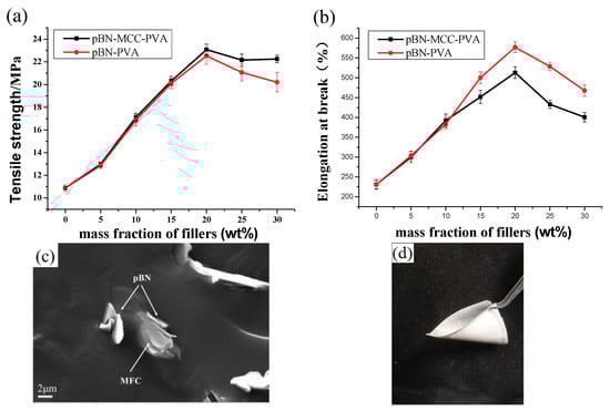 We added increasing amounts of the pBN-MFC hybrid powder to PVA to prepare a series of pBN-MFC-PVA composite films by using a solution method, and investigated the effect on its mechanical properties. We conducted the tests to determine the tensile strength and elongation at the break of these films (Figure 4a,b). The results show that, as the pBN-MFC hybrid powder content increased, both the tensile strength and elongation at break first increased and then decreased. When the additive amount was 30 wt%, the tensile strength and breaking elongation of the pBN-MFC-PVA film increased by 2.4% and 12.5%, respectively, compared with pBN-PVA, and increased by 112.1% and 122.0%, respectively, compared with the film consisting of pure PVA. Clearly, MFC has a large impact on the mechanical properties of materials. Synergetic effects between the hydroxyl groups (-OH) and carboxyl groups (-COOH) of one-dimensional MFC [2] and the hydroxyl groups (-OH) and amino groups (-NH2) of pBN ensure that the interface between pBN-MFC hybrid powder and PVA is highly integrated and this is considered to enhance the mechanical properties (Figure 4c). However, when the amount of pBN-MFC hybrid powder exceeds 30 wt%, the mechanical strength of the composite films begins to decrease. We speculated that, increasing the mass fraction of the filler beyond 30 wt% caused the pBN-MFC hybrid powder to start agglomerating in the PVA, which increased microscopic defects. All of the mechanical properties of the composite materials improved compared with those of pure PVA. Thus, it was necessary to further explore the mechanism of action. The mechanical flexibility of the pBN-MFC-PVA film is demonstrated in Figure 4d.