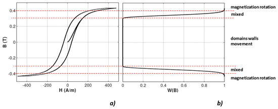 Figure 1 presents the example of the magnetic hysteresis B(H) loop together with W(B) dependence. The region of the domain wall movement, the region of the domains magnetization rotation, as well as the region of mixed mechanism can be clearly observed.