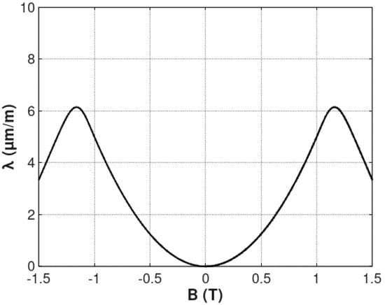 The example of the λanhyst(B) curve stated by Equation (9) is presented in Figure 2. As in the case of real samples, the maximal value of magnetostriction λmax is significantly higher than saturation magnetostriction λs.
