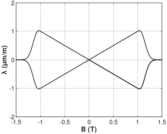 Magnetostrictive λ(B) hysteresis loop, determined by Equation (12), calculated for the parameters: a1 = 5 , a2 = 10 , Bswitch = 1 T, k = 0.1, alift-off = 1 , ahys = 1