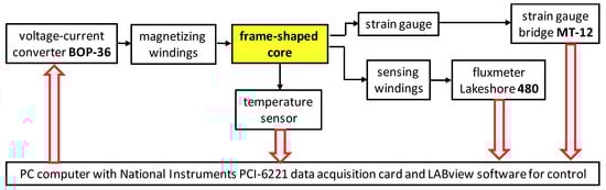 A schematic block diagram of the magnetostriction measuring system [12] is presented in Figure 6. Magnetizing winding of the frame-shaped sample was connected to the voltage-current converter BOP36-6M produced by Kepco, USA. The sensing winding as connected to fluxmeter type 480, produced by Lakeshore, USA, enabling real-time measurements of flux density in the core. The strain gauges were connected to a specialized MT-12 bridge, enabling strain gauge sensitivity adjustments. During the measurements, the temperature of the sample was monitored by the thermocouple-based sensor. The whole system was controlled by PC computer, with LabView software equipped in PCI-6221 data acquisition and control card.