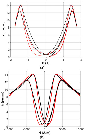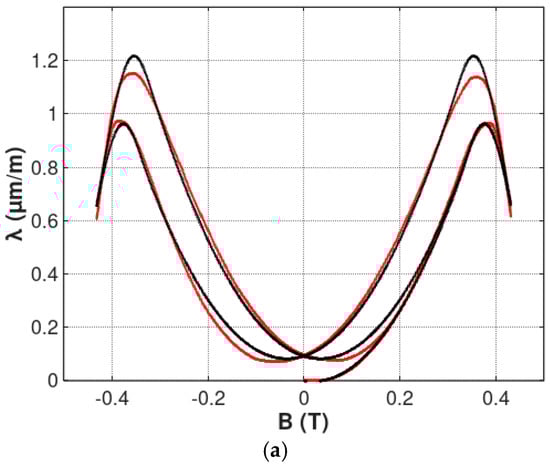 Results of modeling the magnetostrictive hysteresis loops of Mn0.70Zn0.24Fe2.06O4 ferrite for power applications: (a) λ(B) hysteresis loop; (b) λ(H) hysteresis loop. Experimental results—red line; results of modeling—black line.