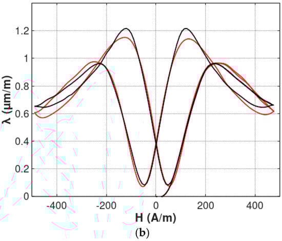 The example of the magnetostrictive λ(B) hysteresis loop is presented in Figure 5. It can be observed that the shape of the λ(B) hysteresis loop well reflects the shape of such loops presented in the literature.