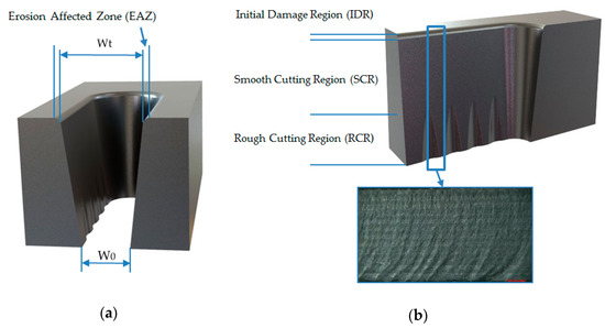 However, the AWJM process shows its own limitations that lead to the appearance of specific defects during the cutting process (Figure 1). The most common defects in the process are the kerf taper, the Erosion Affected Zone (EAZ) and the formation of three possible different roughness zones along the machined surface [22]: