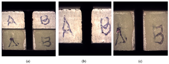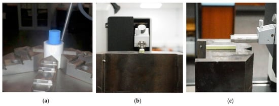 (a) Measure of replica to obtain geometrical results; (b) measure of roughness of UNS A97075, front view; (c) measure of roughness of UNS A97075, side view.