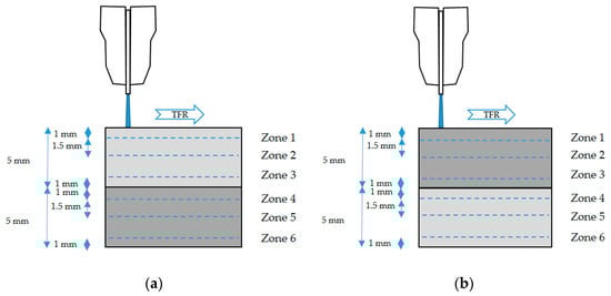 Schematic representing the roughness measurement zones and the distance between them for: (a) UNS A97075/CFRP configuration; (b) CFRP/UNS A97075 configuration.