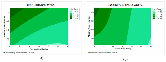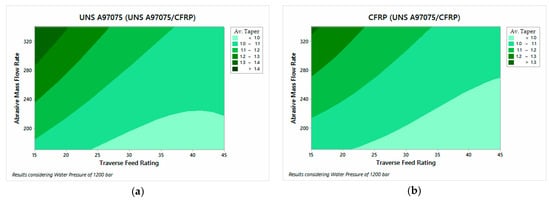 This behavior is shared with the CFRP behavior in CFRP/UNS A97075 configuration. Figure 11b, however, shows a very different behavior. This change is due to the lesser energy of the water beam when it collides with the aluminum. Since a percentage of energy is transformed during the CFRP machining, it appears that the AMFR is the determinant parameter when the cut’s width is examined. As for the differences between the two material configurations, Figure 11 shows that when the jet directly affects the carbon fiber, the taper generated for the best parameter ratio reaches values higher than 1.2 compared to the value 1 reached for the UNS A97075/CFRP configuration. This shows the difference in the mechanical properties of each material, offering greater resistance to penetration of the metallic material.