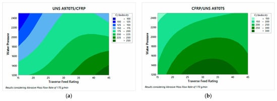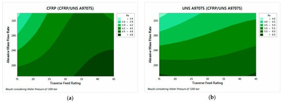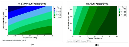The data show that the AMFR parameter has a greater influence on aluminum, especially when it is at the exit of the material. This effect can be seen in the horizontality of the contour graph studied (Figure 13b). As for the composite material, it presents influence of TFR and AMFR for both configurations. In this sense, the data show that the composite material has slightly lower values than the metal alloy because the use of low pressures favors a better surface quality in CFRP to oppose less resistance to cutting. On the other hand, this means that the aluminum registers higher roughness data due to the low kinetic energy of the jet, favoring the appearance of defects in the different areas studied.