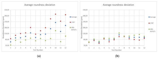 Average roundness: (a) UNS A97075/CFRP configuration; (b) CFRP/UNS A97075 configuration.