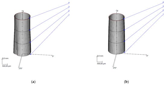 For the evaluation of the holes, a station of measurement Mahr MMQ44 Form Tester (Mahr, Göttingen, Germany) was used to measure the roundness at the entrance and exit of the drill in each material, the cylindricity of the entire profile of the drill, and the straightness in four separate generatrices to 90° as seen in Figure 3a. To analyze the macrogeometric deviations, replicas of the holes due to the impossibility of direct measuring on the material were fabricated. These replicas were made with a polymer type F80 Ra (R.G.X, Plastiform, Madrid, Spain) with the ability to guarantee stability during the measurement process for diameters greater than 4 mm. It is a two component polymer that solidifies after mixture. Plastiform provides a tool that ensures correct mixture while the polymers are injected into the hole that was replicated. It is a manual process that leads to hole replicas after 10 minutes of polymer solidification.
