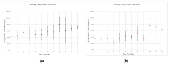 In this case, there is no distinction between materials and straightness was evaluated throughout the entire profile. Thus, Figure 17 shows a comparison between the values obtained for the two configurations. However, Appendix E shows all measured data with the numerical value of the standard deviation.