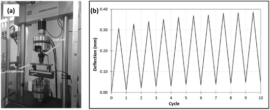 The fatigue lives at various stress levels of the LCCs were determined by subjecting the LCC specimens (MTS810 Test System, as shown in Figure 1; support span 300 mm, loading span 100 mm, and LVDTs for deformation measurement) under load control mechanism between two limits (with a sinusoidal force variation in time) at different stress levels ‘S’ (S = fmax/fr, where fmax = maximum fatigue stress, and fr = static flexural stress).