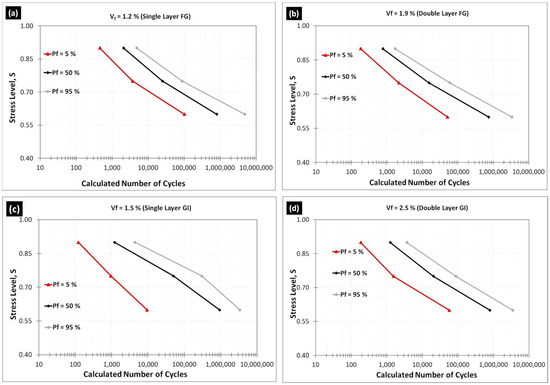 where, ‘S’ refers to the stress range, ‘fmax’ is the maximum stress level to which the specimen is subjected, ‘N’ is the number of cycles to failure, and ‘a’ & ‘b’ are experimental coefficients. The experimental coefficients (‘a’ and ‘b’) of Equation (1) can be obtained for LCCs with different reinforcement ratios, and different FAC weight fractions from the fatigue test data obtained in this investigation using regression analysis (based on method of least squares) by plotting the stress level against log10(N). The values of material coefficients as obtained from the regression analysis are a = 1.1808 and b = −0.0924 for single layer FG reinforced LCC, a = 1.1280 and b = −0.0844 for single layer GI (Galvanized Iron) reinforced LCC, a = 1.1352 and b = −0.0903 for double layer FG (Fiber Glass) reinforced LCC, and a = 1.1700 and b = −0.0957 for double layer GI reinforced LCC.