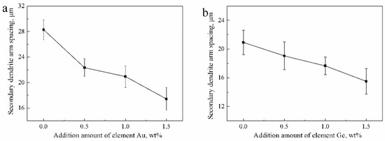 Secondary dendrite arm spacing of the Ag-1.5Cu-0.1Y alloys with different additions of Au and Ge: (a) Ag-1.5Cu-0.1Y-xAu alloys and (b) Ag-1.5Cu-0.1Y-1.0Au-xGe alloys (x = 0–1.5). The error bars represent the standard deviation of the five replicates.