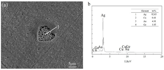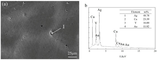 The appearance of black aggregates may affect the properties of a Ag-1.5Cu-0.1Y alloy. Therefore, we further analyzed the composition of the black aggregates. The results of the energy dispersive spectrometer (EDS) analysis of the dendrites and intergranular of Ag-1.5Cu-0.1Y alloys with different Au and Ge additions are shown in Table 2 and Table 3, and the black agglomerations are shown in Figure 5 and Figure 6, respectively. When the addition of Au reached 0.5 wt.%, the presence of Au was detected at the grain boundary, but the Au was not detected in the crystal (Table 2). This was also the case in the Ag-1.5Cu-0.1Y-1.0Au alloys with 0.5 wt.% Ge added (Table 3). This may be due to the low addition of Au and Ge resulting in a small amount of the Au and Ge solid solution in the alloy crystal, which was not easy to detect. Au was detected in both the intragranular and grain boundaries of the Ag-1.5Cu-0.1Y alloys with an Au content of 1.0 wt.% and 1.5 wt.%, and there was little difference between intragranular and intergranular contents (Table 2). These data also indicated that the Au was soluble in the alloy structure, which was consistent with the content of the Ag–Cu alloy being able to form a continuous solid solution phase and infinite solid solution [24]. The EDS results showed that the black aggregates were mainly composed of 48.78 wt.% Ag, 23.39 wt.% Cu, 16.00 wt.% Y and 11.82 wt.% Au (Figure 5b). Since the XRD analysis results of the Ag-1.5Cu-0.1Y-1.5Au alloy (Figure 1a) found no new diffraction peak, this means that the black aggregates were the aggregates of Cu, Y and Au elements and not a new intermetallic compound. Ge elements were also detected in both the intragranular and grain boundaries in the Ag-1.5Cu-0.1Y-1.0Au alloys with 1.0 wt.% and 1.5 wt.% Ge added (Table 3). The EDS results showed that the black aggregates of Ag-1.5Cu-0.1Y-1.0Au-1.5Ge were Cu, Y, Au and Ge aggregates composed of 92.83 wt.% Ag, 0.41 wt.% Cu, 4.91 wt.% Au and 1.85 wt.% Ge (Figure 6b). It was reported that the maximum solid solubility of Ge in Ag at the eutectic point (651 °C) was 9.6% (6.68 wt.%) [25], the appearance of black aggregates might be because 1.5% wt.% Ge was not dissolved well enough in Ag.