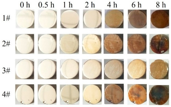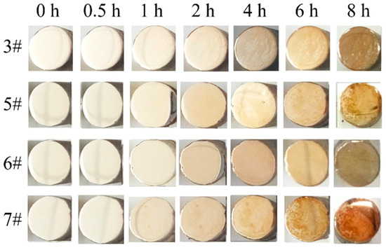 The corrosion resistance of the Ag-1.5Cu-0.1Y alloys with Au added increased when compared with the Ag-1.5Cu-0.1Y alloy with no Au added (Figure 7). The Ag-1.5Cu-0.1Y alloy with an Au amount of 1.0 wt.% had the best corrosion resistance among the four samples, and its surface began to become slightly yellow when the corrosion resistance experiment was carried out to 4 h. The Ag-1.5Cu-0.1Y alloys with 0.5 wt.% and 1.5 wt.% Au added began to become yellowish when the vulcanization test was carried out for 2 h, and the corrosion resistance was worse than that with 1.0 wt.% Au. The corrosion resistance increases of the Ag-1.5Cu-0.1Y alloys with Au added could be explained by the fact that the electrode potential was higher in Au (1.692 V) than in Ag (0.799 V). The addition of Au increased the electrode potential of the Ag-1.5Cu-0.1Y alloy, and the vulcanization reaction was mainly an electrochemical corrosion. Therefore, adding Au can significantly improve the corrosion resistance of the Ag-1.5Cu-0.1Y alloy. The lower corrosion resistance of Ag-1.5Cu-0.1Y-1.5Au than Ag-1.5Cu-0.1Y-1.0Au could be explained by the fact that aggregates containing a lot of Cu and Y elements appeared in the matrix of the Ag-1.5Cu-0.1Y-1.5Au alloy, so the lower electrode potential of elements Cu and Y resulted in selective vulcanization [26].