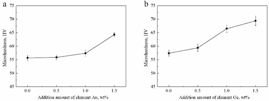 Microhardness of the Ag-1.5Cu-0.1Y alloys with different Au and Ge additions in (a) Ag-1.5Cu-0.1Y-xAu alloys and (b) Ag-1.5Cu-0.1Y-1.0Au-xGe alloys (x = 0–1.5). The error bars represent the standard deviation of the six replicates.