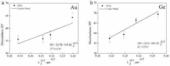 Linear fitted between the microhardness and the λ2 of (a) Ag-1.5Cu-0.1Y-xAu and (b) Ag-1.5Cu-0.1Y-1.0Au-xGe (x = 0–1.5).