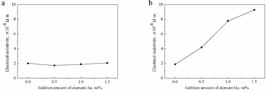 The electrical resistivity of the Ag-1.5Cu-0.1Y alloys with the addition of 0.5 wt.% and 1.0 wt.% Au were lower than that of the no Au sample, whereas the electrical resistivity of the Ag-1.5Cu-0.1Y alloy with 1.5 wt.% added was slightly higher than that of the without Au added sample (Figure 11a). With the increase in the addition of Ge, the electrical resistivity of the Ag-1.5Cu-0.1Y alloy increased, leading to the decrease in the conductivity of the Ag-1.5Cu-0.1Y alloys (Figure 11b). The above data indicated that adding a small amount of Au could improve the conductivity of the Ag-1.5Cu-0.1Y alloy; however, adding too much Au reduced the conductivity of the Ag-1.5Cu-0.1Y alloy.