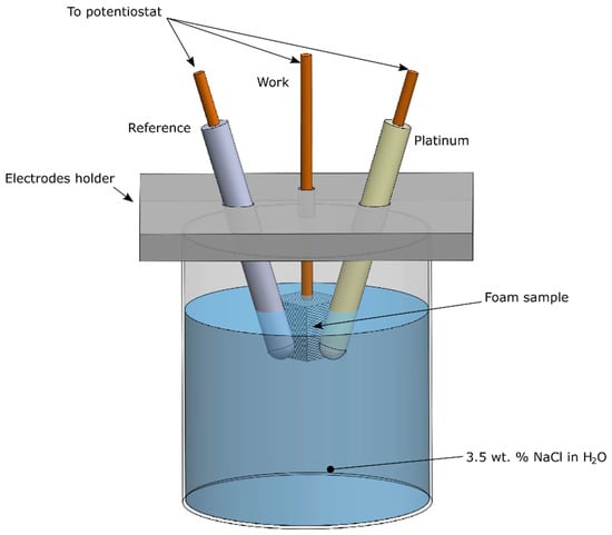 In addition, corrosion tests were performed on the samples to evaluate the protection offered by the Ni coating on the aluminium foam. In order to study the corrosion behaviour, the “VoltaLab” potentiostat (VoltaLab 80, Radiometer Analytical, Villeurbanne, France) was adopted to produce the Tafel curves of the annealed samples. The auxiliary electrode, used for the test, was made in platinum, whereas the reference one was a saturated calomel electrode (SCE), according to the schematic of Figure 1. The corrosion resistance was evaluated in water solution with 3.5 wt. % of NaCl; before the tests, the solution was degassed.