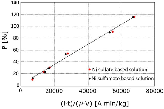 In Figure 2, the percentages of nickel deposited P% as a function of the variable term of Equation (4) is reported; the slope of the linear trend (the first fraction of Equation (4)) assumed the value 1.8 × 10−3 A min/kg regardless of the electrolyte, which was in good agreement to the calculated value. Thus, Equation (4) accurately predicts the amount of deposited Ni. It is worth noting that the equation can be adopted in the case of an open cell foam, for both Ni sulphate and Ni sulphamate solutions.