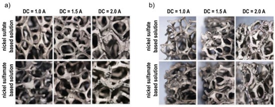 Aluminium foam substrates were coated via electro-deposition. An electrolytic cell at 25 °C was used. Two different electrolytic solutions were studied: the Watts solution (i.e., a nickel sulphate-based solution) (NiSO4·6H2O: 225 g/L; NiCl2·6H2O: 30 g/L; H3BO3: 30 g/L), as adopted in [], and a nickel sulphamate solution (Ni(NH2SO3)2·4H2O: 300 g/L; NiCl2·6H2O: 30 g/L; H3BO3: 30 g/L), generally adopted for the deposition of functional coatings or for electroforming [].