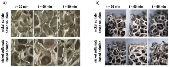 Images of foams after Ni electro-deposition at 1.5 A and different deposition times: (a) internal part; (b) external part.