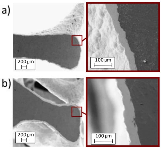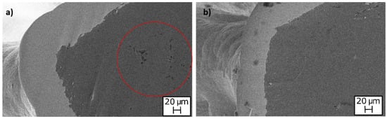 In addition, SEM analysis was performed to establish the maximum temperature that did not cause defects. It was found that the annealing treatment at 300 °C determined porosity inside the aluminium (red circle in Figure 11a), which could reduce the mechanical strength of the aluminium foam. This degradation did not occur at temperatures lower than 300 °C (Figure 11b). These observations agree with the results of mechanical characterization, which showed significant reduction of mechanical performances after annealing performed at temperatures higher than 300 °C. However, as visible in Figure 10a, the coating was still adherent to the substrate at a high temperature.