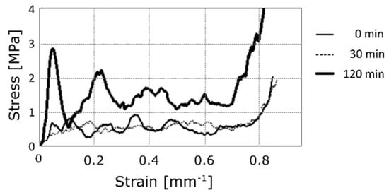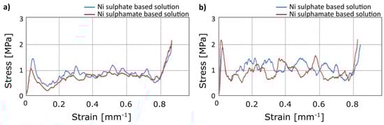 In order to characterize the mechanical performance of the coated foams, compression tests were performed. Figure 7 shows the typical stress-strain curves for different deposition times at 1.5 A for the nickel sulphate solution. It is worth noting that the irregularities correspond to the progressive initiation of plastic buckling of the brackets in the foam [,,]. According to the scientific literature, three different zones can be identified: first, the elastic zone, then a plateau, and last, the failure of the material. After the elastic zone, most of the samples show a drop in resistance; this trend has already been verified in other works []. In the figure, the mechanical behaviour of the uncoated aluminium foam (deposition time of 0 min) is compared to the performances exhibited by the coated ones, at increasing deposition times, using the nickel sulphate solution, which seemed to minimize the formation of surface defects. A sliding up of curves proportional to the deposition time, and thus to the density, can be observed. Stiffness seemed to be unaffected by the electro-deposition of nickel. On the contrary, the yield stress was clearly improved.