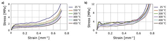 Compression test: Stress-strain curves at (a) 25 °C; after annealing at (b) 300 °C; (c) 450 °C.
