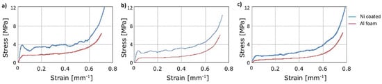 The results are summarized in Table 2: Ni-coated foams showed higher values of stress for all the considered temperatures of annealing. This fundamental aspect means that Ni-coated foams could also be used after exposure to elevated temperature, whereas aluminium foams do not provide adequate mechanical properties.