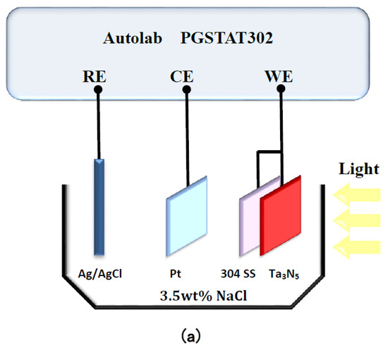 The electrochemical noise module (ECN) was used to measure the photogenerated current of the two kinds of Ta3N5 electrodes as a function of time, in the dark and under illumination. As shown in Figure 1b, the working electrode Ta3N5 was placed opposite the 304 stainless steel counter electrode (connected to the ground wire in ECN measurements, so that electrons can flow from the Ta3N5 electrode to the 304 stainless steel electrode); the Ag/AgCl electrode was connected likewise as reference electrode. All the measured potentials were relative to the Ag/AgCl electrode (0.1981 V). The electrolyte, 3.5 wt% NaCl solution, was replaced for each new measurement. The light source was a 300 W PLS-SXE 300 Xe lamp (Beijing PerfectLight Co. Ltd., Beijing, China). The experimental temperature was at room temperature.