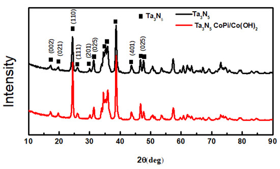The XRD patterns of the as-prepared Ta3N5 material with and without CoPi/Co(OH)2 modification are shown in Figure 3. When 2θ is at 17.21°, 19.74°, 24.47°, 26.00°, 30.09°, 33.85°, 34.49°, 36.01°, 38.68°, 43.67°, 46.67°, and 47.75°, the diffraction peaks are basically consistent with the standard Tantalum Nitride Ta3N5 (JCPDS card no. 19-1291). These peaks match with the (002), (021), (110), (111), (201), (025,) (401), and (025) crystal planes completely. The other weaker peaks include the Ta matrix and a small amount of tantalum nitride compounds of other valences arising from the nitriding treatment. A comparison of the modified and unmodified Ta3N5 materials reveals that the diffraction peak position and peak intensity of the two curves almost coincide. Moreover, no peaks are observed for CoPi/Co(OH)2, indicating that their amounts may be too low to be detected by XRD. This could also imply that the CoPi/Co(OH)2 additives merely adhered to surface of the Ta3N5 nanorod-array, causing the observed agglomeration.