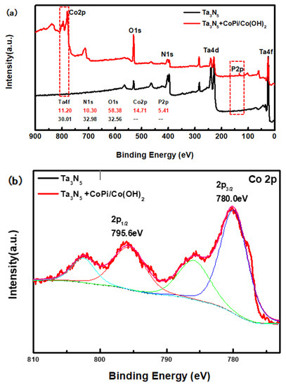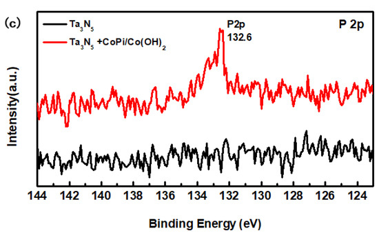 From the high-resolution spectra of CoPi/Co(OH)2 for the modified Ta3N5 (Figure 4b), the binding energies of Co 2p3/2 and 2p1/2 (the red curve) are 780.0 eV and 795.6 eV, respectively. Furthermore, the peak of P 2p at 132.6 eV could be mainly attributed to the P element in CoPi in Figure 4c (the red curve). Both sets of results confirm the presence of CoPi/Co(OH)2 on the modified Ta3N5.