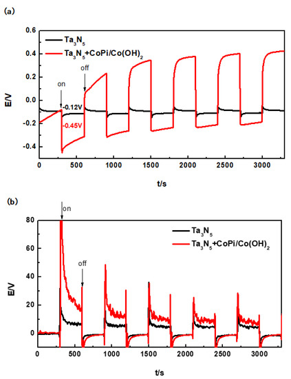 The corrosion potential of the 304 stainless steel was initially determined to be approximately −0.17 V in 3.5 wt% NaCl solution by potentiodynamic polarization measurements. The unmodified Ta3N5 also has photocatalytic activity [23,24,39] and theoretically should generate some degree of protective potential. However, the actual results in Figure 6a show that the potential of the unmodified Ta3N5 could only reach to −0.12 V after the first illumination (300 s). It remained stable under illumination and did not change with the continued illumination. This means that the OCP of the unmodified Ta3N5 (−0.12 V) is more positive than that of 304 stainless steel (−0.17 V). Therefore, the unmodified Ta3N5 cannot achieve electrochemical protection of 304 stainless steel.