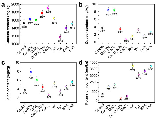 Distributions of four metallic elements in silk fibers. (a) Calcium content, (b) Copper content, (c) Zinc content, (d) Potassium content. The X axis is silk fiber samples obtained from different diet additives and the control is the normal silk obtained from the traditional diet without any additives. Data are mean ± sd. (Ser = serine, Tyr = tyrosine, SAA = sericin amino acid, FAA = fibroin amino acid).