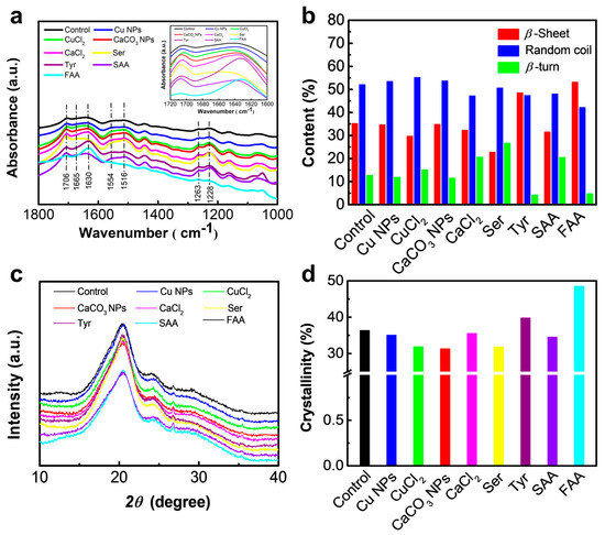 Secondary structure of silk fibers. (a) Fourier-transform infrared (FTIR) spectra of silk fibers obtained from normal and modified diets and the small image is the FTIR spectra in amide I band; (b) content of β-sheet, β-turn and random coil after deconvolution of FTIR spectra in amide I band. (c) X-ray diffraction (XRD) spectra of silk fibers; (d) Crystallinity percentage of silk fibers. The X axis for (b,d) is silk fiber samples obtained from different diet additives and the control is the normal silk obtained from traditional diet without any additives. (Ser = serine, Tyr = tyrosine, SAA = sericin amino acid, FAA = fibroin amino acid).