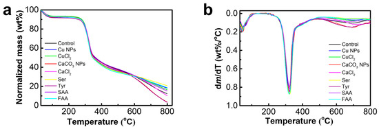 TGA results of silk fibers. (a) TG curves; (b) DTG curves.