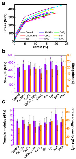 Quasi-static tensile behaviour of silk fibers. (a) Typical stress-strain curves, (b,c) are mechanical properties of tensile strength, elongation, Young’s modulus, and strain energy density of experimental groups. Data are mean ± sd. Statistical analyses were performed using unpaired two-tailed Student’s t-test (* p < 0.05). The X axis for (b,c) is silk fiber samples obtained from different diet additives and the control is the normal silk obtained from traditional diet without any additives. (Ser = serine, Tyr = tyrosine, SAA = sericin amino acid, FAA = Fibroin amino acid).