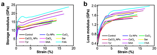 The static and dynamic mechanical properties of the silk fibers were evaluated using quasistatic and continuous dynamic tensile tests. Representative stress-strain curves of each sample from quasistatic tensile tests were obtained and are shown in Figure 4a. Static mechanical properties were then calculated from stress-strain curves and summarized in Figure 4b,c. The ultimate tensile strength of the modified silk fibers increases to varying degrees compared to the control silk fibers (332 MPa), except for the fibers obtained by Ca2+ feeding. Specifically, the corresponding mean values of the silk fibers obtained by fed additive Cu NPs, Ser, Tyr, and FAA are 378 MPa, 380 MPa, 415 MPa, and 412 MPa, respectively. Moreover, FAA-modified silk fibers exhibit a significantly higher elongation value of 21%, whereas those of the other samples are within the range of 15–19%. As for the index of Young’s modulus, silk fibers from the SAA diet exhibit the highest value (12.6 GPa). However, obvious decreases in Young’s modulus are observed in metallic ion-modified silk fibers. As a consequence of the differences in Young’s modulus, elongation, ultimate tensile strength, and the calculated strain energy density vary among different additives. The value of strain energy density is 63 MJ/m3 for FAA-modified silk fibers and 59 MJ/m3 for the Tyr-modified group, which is significantly larger than that of the control group (42 MJ/m3). The improved static mechanical properties of modified silk fibers obtained from FAA or Tyr additives are highly related to the increase of β-sheet contents and crystallinity.