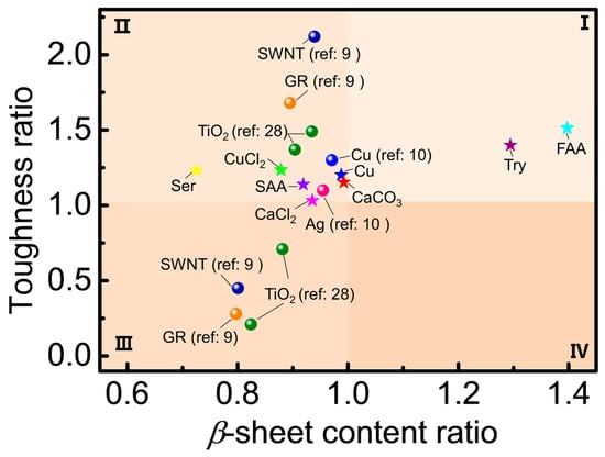 The secondary structures and properties of modified silk fibers vary with different additives. For example, both organic dyes and NPs hindered the formation of β-sheets as well as crystallites, despite the observed improvements in the mechanical properties of NPs-modified silk fibers [9,10,28,58]. The detailed relationship between the ratios of β-sheet content and mechanical properties (toughness as a represent) of silk fibers between the modified and control groups of previous studies and the present investigation are summarized in Figure 6. Most additive-modified silk fibers exhibited a toughness ratio above one, with a β-sheet content ratio below one. These additives with the studied concentrations can improve the mechanical properties of silk fibers but hinder β-sheet conformational transitions. The incorporation of excessive materials such as TiO2 NPs, SWNT, or GR also resulted in the deterioration of the mechanical properties of silk fibers, as well as low β-sheet content. In particular, Tyr and FAA used in this study not only led to an increase in toughness but also induced the conformational transition of silk fibroin from random coils to β-sheet. This is the first report that describes the positive effects of additives on both β-sheet conformation transition and mechanical properties. Therefore, further efforts should be made on elucidating the molecular mechanism of Tyr and FAA feeding for silkworm larvae in relation to low biotoxicity and cost in producing high-crystalline and strong silk fibers.