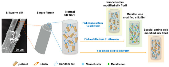 Silk fibers from Bombyx mori silkworms are receiving significant attention for various functional textiles, biomaterials, and nanodevices, due to their outstanding mechanical properties, biocompatibility, and degradable characteristics [1,2,3,4,5]. Currently, tremendous efforts have been made to fabricate enhanced or functionalized silk fibers or silkworm cocoons through various physical [6,7,8,9,10,11,12,13,14], chemical [15,16,17,18], and biological processes [19,20,21,22]. It is of particular interest that direct feeding silkworm larvae with a series of additives (e.g., organic dyes [23,24,25], nanoparticles (NPs) [9,10,26,27,28,29], unnatural amino acids [30], as well as bordeaux mixture [31]) is a green and sustainable in-situ functionalization approach to modify silk fibers. In this case, these feeding additives mainly distribute in silk fibroin rather than silk sericin, which can improve the thermal and mechanical properties of silk fibers [10,24,32]. Nevertheless, research [9,10,28] has indicated that these additives hinder the conformational transition from random coil/α-helix to β-sheet of silk fibroin and reduce the degree of crystallinity. This implies that the secondary structures and mechanical properties of silk fibers could be further optimized and improved through the feeding of appropriate additives.