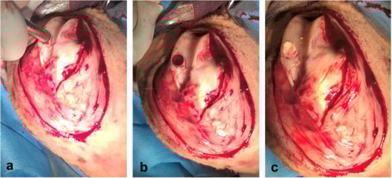 The animals were included into the study 30 days before the scheduled day of surgical intervention, allowing acclimatization to the changed environment. Before the inclusion into the study, the animals underwent standard preoperative clinical examinations. Clinical examinations included the assessment of the overall health status of the animals (food intake, behavior), inspection and recording of body temperature, respiratory and pulse rates, and a detailed evaluation of the organ systems [16]. After surgical intervention, the health status of the animals was evaluated daily until the end of the study, and was oriented to the observation of general health state after the surgical procedure, as well as local signs of inflammation in the surgical wound (heat, swelling, pain, discharge).