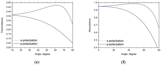 Figure 2e shows the dependence of the PyC/PDMS bilayer transmittance on the incidence angle for s- and p-polarized waves calculated at the frequency of 0.5 THz for PyC film thickness of 100 nm (compare with our previous work [6]). It is worth noting that the s–polarized wave transmittance decreases with an increase in the incidence angle, while the transmittance of the p-polarized wave transmittance shows non-monotonous dependence on the angle of incidence. Incidence angle dependence of the PyC/PDMS/PEC structure absorptance (see Figure 2d) clearly shows that for both polarizations, such a structure is capable of absorbing more than 90% of the incident radiation provided that the incidence angle does not exceed 50°. This implies that the proposed absorber possesses high angle stability, which is one of the most practical important requirements.