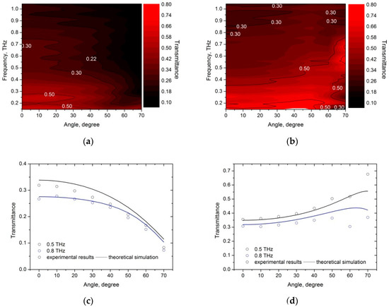 Contour plot of the PyC/PDMS bilayer transmittance for the (a) s- and (b) p-polarized waves on the frequency/angle of incidence plane (experimental data). The incidence angle dependence of the PyC/PDMS transmittance at 0.5 and 0.8 THz for the (c) s- and (d) p-polarizations. Circles and solid lines show, respectively, experimental data and results of numerical simulation at lPyC = 100 nm, lPDMS = 200 μm, σPyC = 3.2 × 104 S/m, εPDMS = 2.3 + 0.12i.