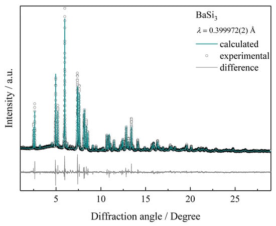 Phase designation was conducted by X-ray powder diffraction experiments with a Huber Image Plate Guinier Camera G670 (Huber Diffraktionstechnik GmbH & Co. KG, Rimsting, Germany), using CuKα1 radiation, λ = 1.54056 Å. High-resolution X-ray diffraction experiments of BaSi3 were conducted with synchrotron radiation (λ = 0.399972(2) Å) at beamline ID22 of the European Synchrotron Radiation Facility. All crystallographic calculations including the determination of diffraction peak positions as well as lattice parameter and crystal structure solution and refinement by the Rietveld technique (Table 1 and Table 2) were performed with the WinCSD program package, version 2018 [].