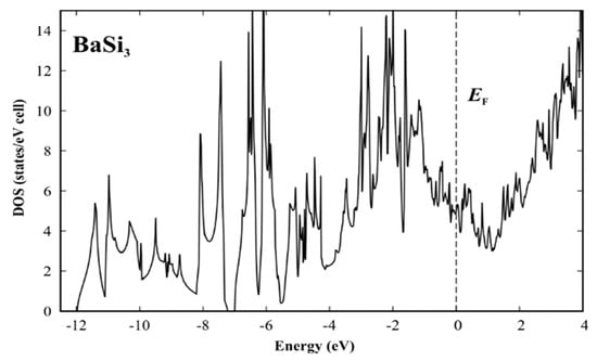 Calculated electronic density of states (DOS) for the idealized structure model [] of BaSi3.