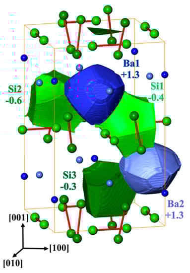The calculated electron density reveals Ba species with almost spherical shape indicating essentially ionic character. The shapes of the silicon species have a more polyhedral character, especially the contact faces between the two nearest silicon atoms appear rather flat, which is characteristic for non-polar covalent bonding. Integrating the electron density within the QTAIM shapes and subtracting the atomic number yields effective charges. The net charge transfer from barium to silicon (Figure 5) is in accordance with the electronegativity difference of the constituents. The effective charges of the barium species (+1.30) fall into the range of +1.2 to 1.4 which is observed for barium–germanium clathrates [] but are markedly smaller than those of calcium in CaSi3 (+1.44, +1.49 []). Moreover, the computed charges of silicon in BaSi3 (−0.3 to −0.6) show a larger spread than those in CaSi3 (−0.40 and −0.54). Both findings consistently indicate a slightly different organization of the bonding in BaSi3 in comparison to the other trisilicides.